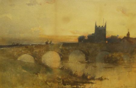 Scottish River Landscape at Sunset with Figures on a Bridge