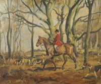 Huntsman with hounds in woodland