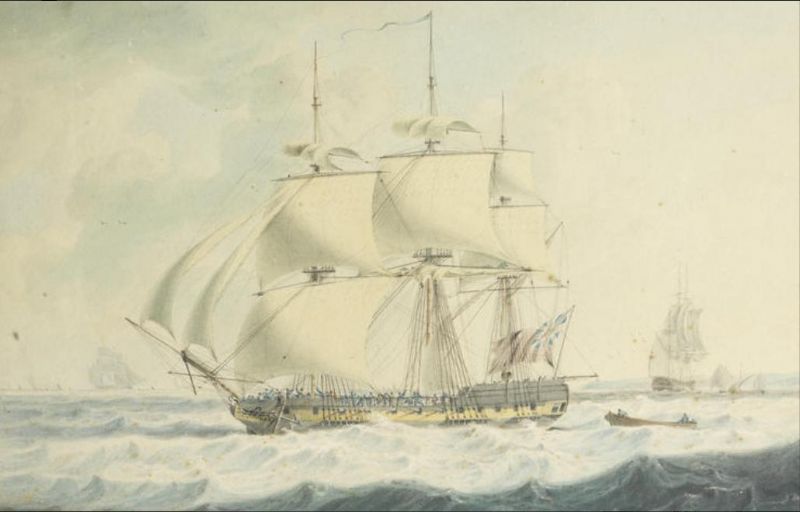 | H.M.S. Thisbe running down the Channel under reduced sail in the choppy conditions, with other shipping nearby | |