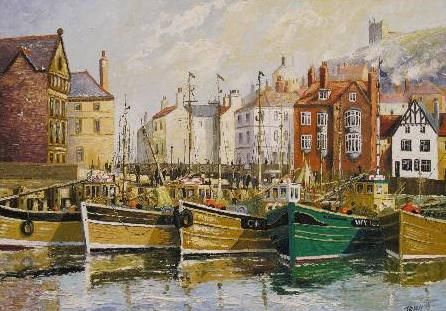 Whitby harbour with numerous fishing boats, buildings and figures on the quay