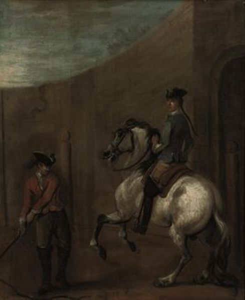 A Gentleman on a grey charger being schooled in an arena