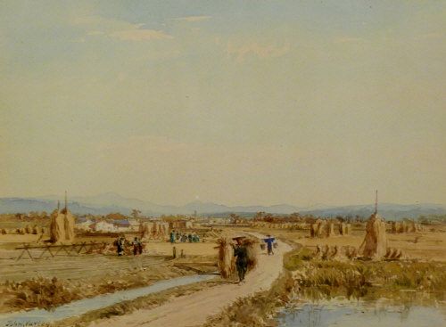 A LANDSCAPE IN CHINA, WITH FARM WORKERS ON A PATH