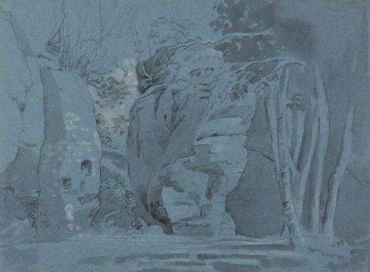 | Charcoal and monochrome wash, heightened with white chalk, on blue paper | |