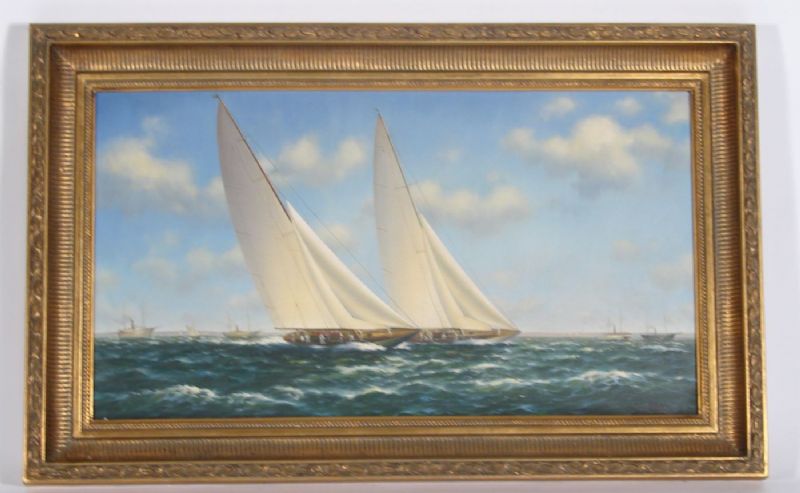 | he America's Cup finals of Rainbow and Endeavour, with a spectator fleet of private steam yachts in the distance. | |