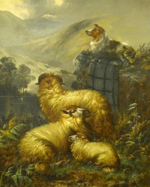 Collie upon a rock standing guard over a ram, ewe and lamb within a highland landscape