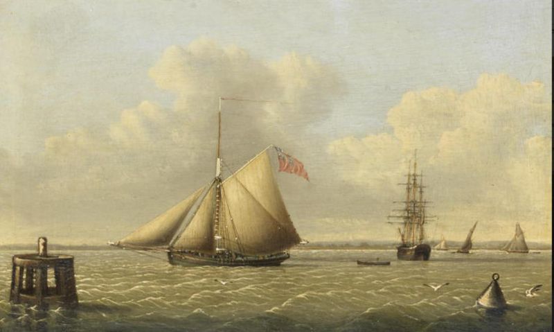 | A trading cutter running out to sea past a mooring 'dolphin', with other shipping in the Humber | |