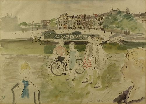 Town scene with figures by a canal