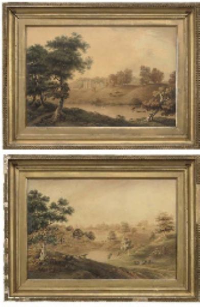 | A country house in a parkland landscape with deer and swans; and An extensive parkland landscape with cattle and deer | |