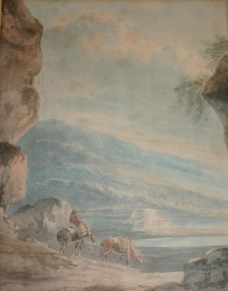 A MOUNTAINOUS LANDSCAPE WITH A TRAVELLER AND TWO MULES