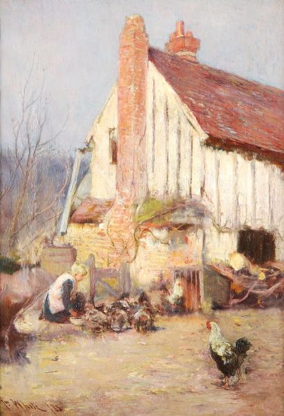 Farmyard with child feeding chickens