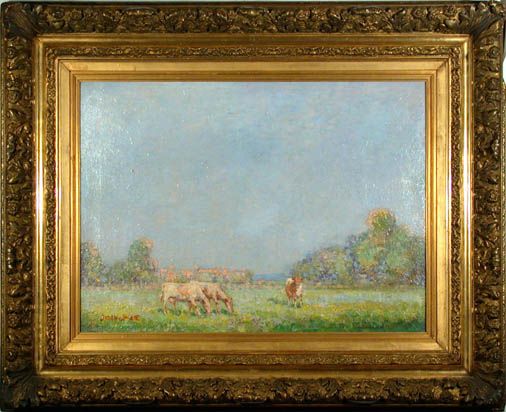 Grasende Kühe auf einer blühenden Wiese unter weitem Sommerhimmel