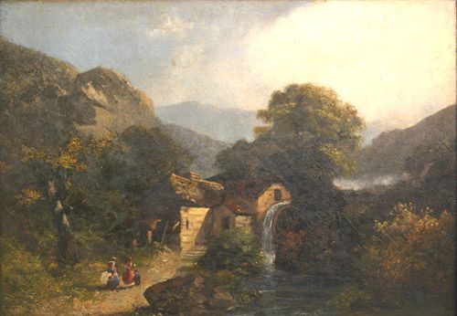 | Landscape with Figures on a Path, a Water Mill and Mountains in the distance | |