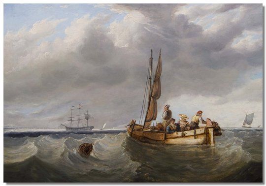 | Figures in a boat, in a choppy sea, with further boats beyond | |