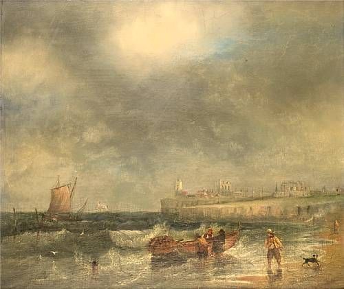 | High tide on the beach at Tynemouth, with the lighthouse and the ruins of the old Priory on the headland beyond | |