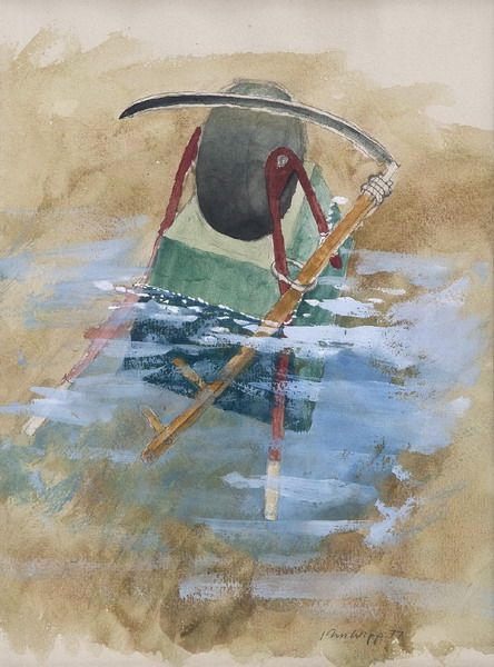 Komposition med lie och skottkärra