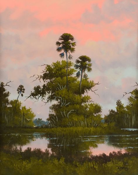 Florida Highwaymen backwater sunset sky scene with tree stands and birds