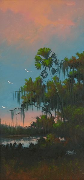 Florida Highwaymen backwaters sunset with palm trees and birds in flight