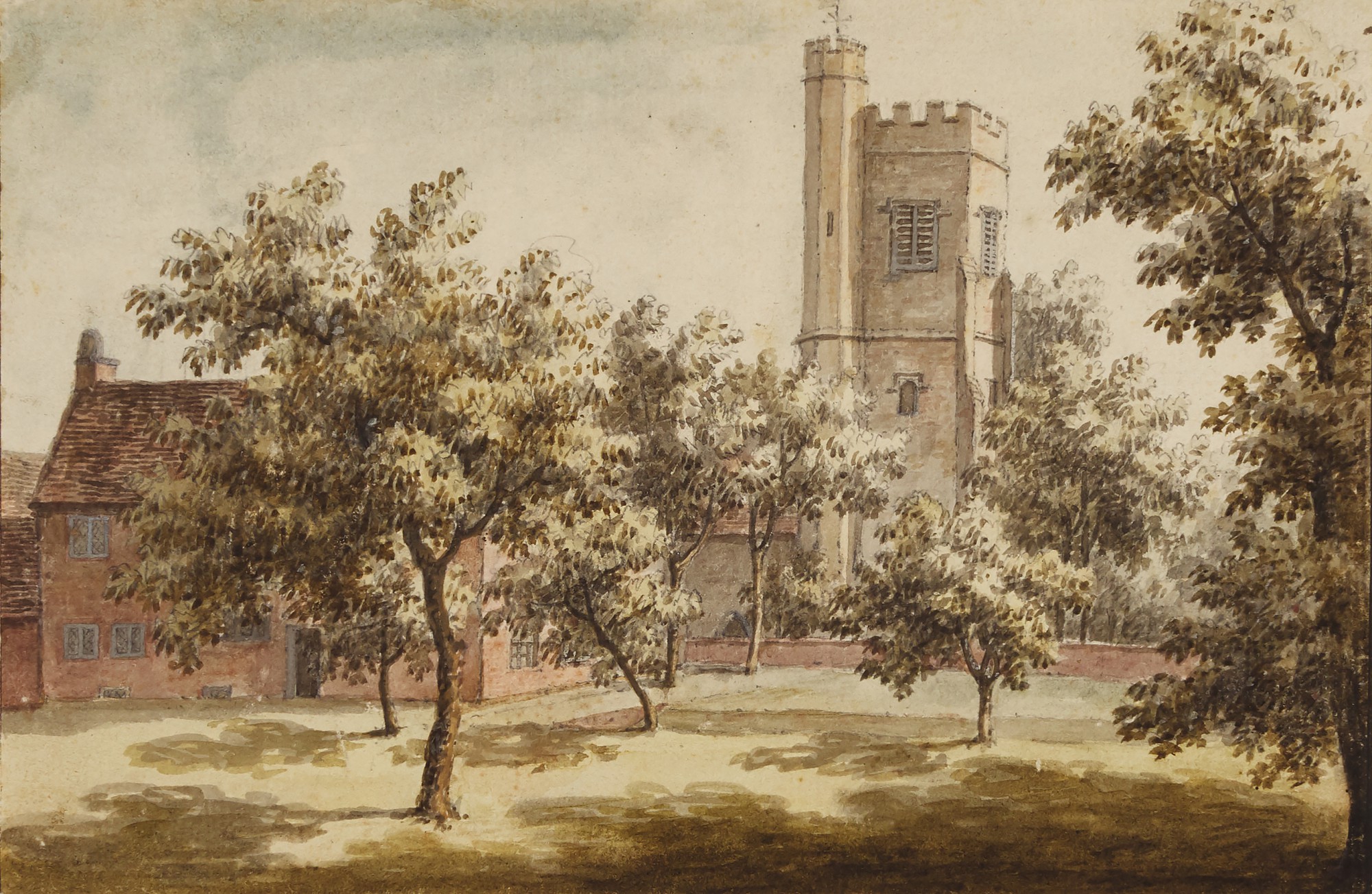 | A church tower seen from an orchard, probably St. Mary's, Beddington | |