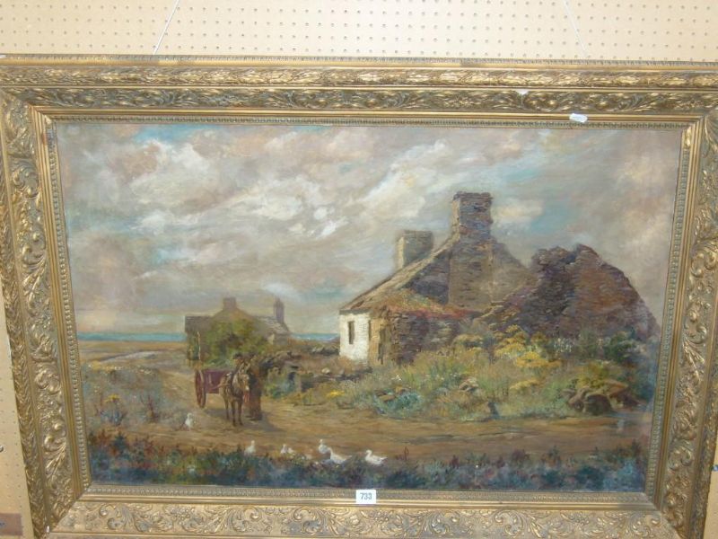 | Ruined cottages with distant sea and in the foreground a donkey cart | |
