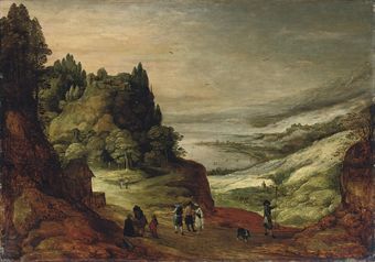 | An extensive mountainous river landscape with figures conversing on a track, a village beyond | |