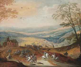 | A cavalry skirmish in a hilly landscape, a convoy beyond | |