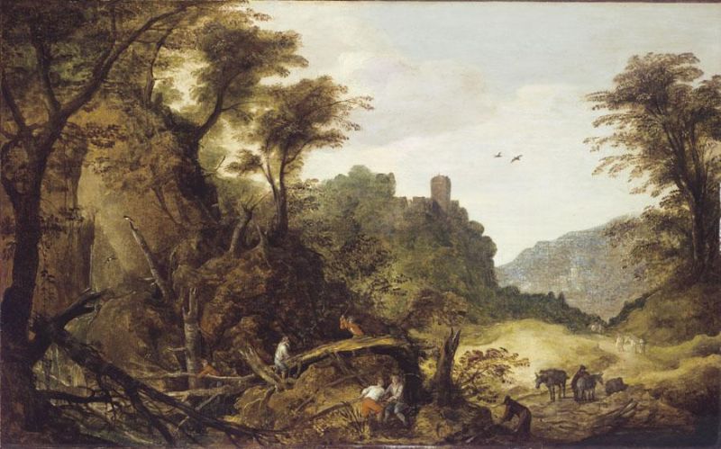 | A MOUNTAINOUS LANDSCAPE WITH FORRESTERS, A CLIFFTOP CASTLE BEYOND | |