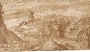 | Dorflandschaft mit einer Windmühle und einem Hirten mit Schafen | |
