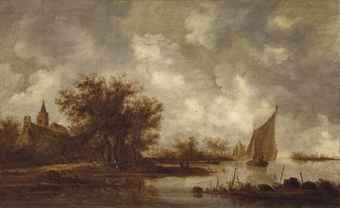 | A river landscape with figures near the shore of a lake, a church beyond | |