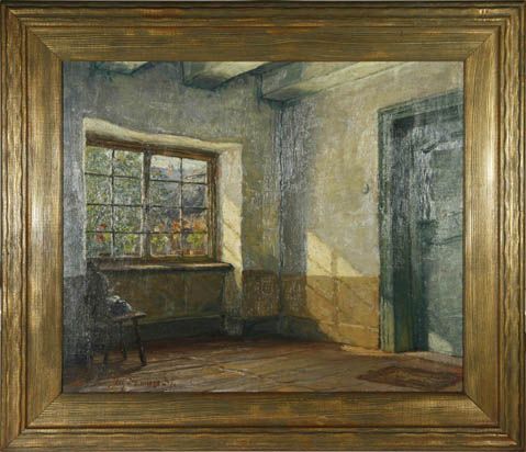 | Sommerliches Interieur mit Bauernstuhl. Durch das breite, versprosste Fenster blickt man auf einen Garten und die Stadt dahinter | |