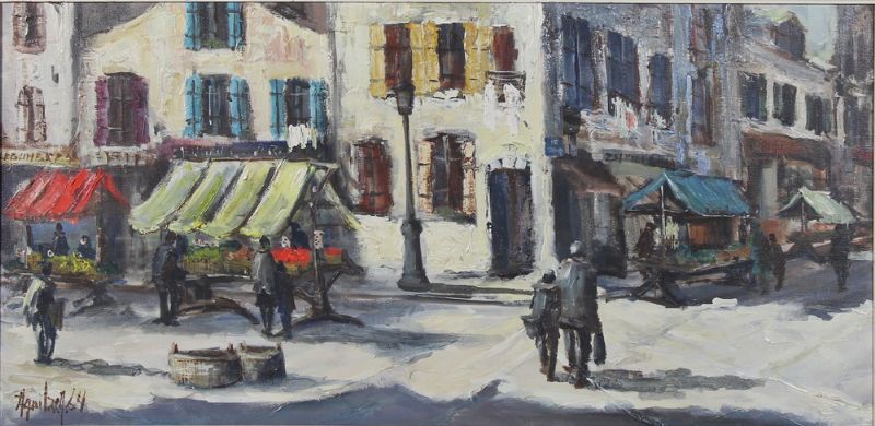Continental street scene with market stall and figures