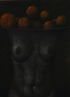 Woman torso and oranges