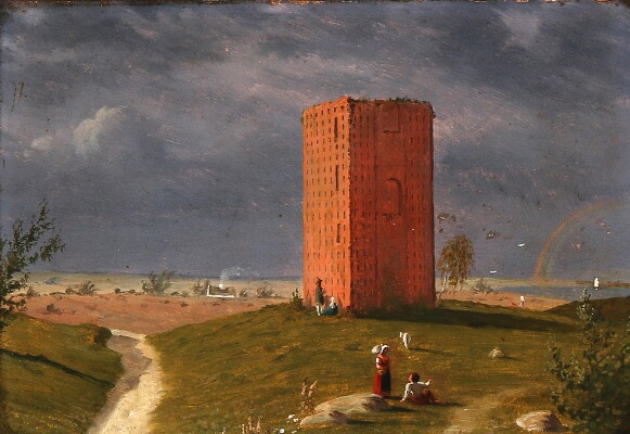 Landscape with tower and rainbow, probably from Østerlen in Sweden