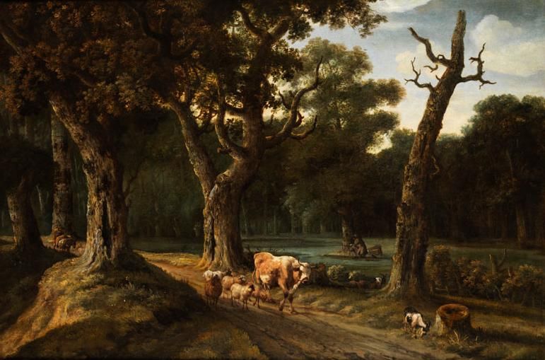 WALDLANDSCHAFT MIT KUH, SCHAFEN UND EINEM ANGLER