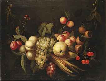 | A garland with plums, blackberries, peaches, white and black grapes, a quincy, corn, cherries, apricots and other fruit | |
