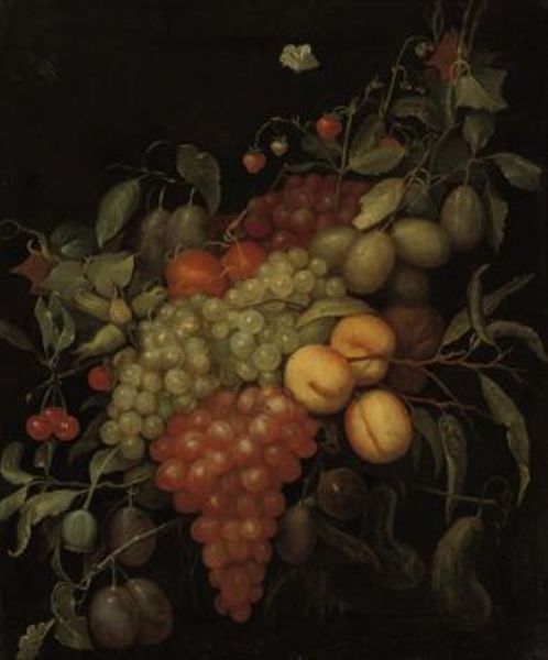 | Peaches, plums, grapes, cherries and strawberries and other fruit, a fly and a butterfly | |