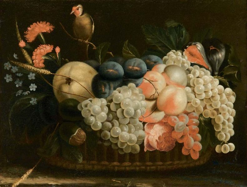 Cesta di frutta con uccellino
