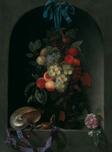| Magnificent still life with grapes, peaches, prunes, lemons, and pomegranates attached to a blue band in a niche, a nautilus she | |