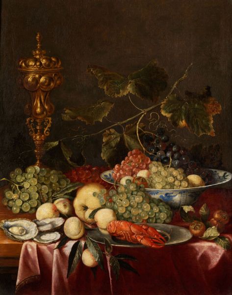 | PRÄCHTIGES STILLLEBEN MIT TRAUBEN, ZITRONEN, FLUSSKREBS UND GOLDPOKAL | |