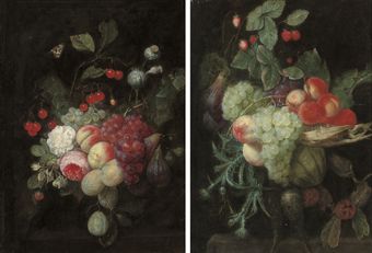 | Roses, grapes, peaches, cherries, figs, poppies and other vines on a stone ledge; and Grapes, peaches, strawberries, figs, a mel | |