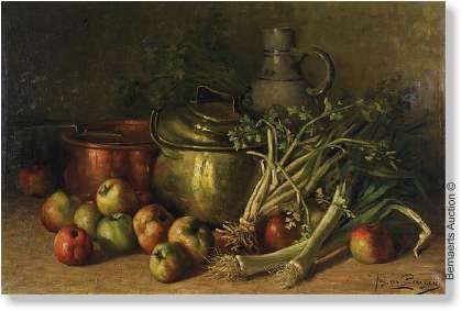 Nature morte aux fruits et légumes (poireaux, pommes et marmites en cuivre)