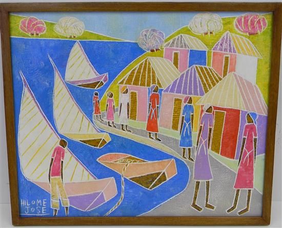 Harbor, colorful sea and landscape, four boats, five houses and eight figures