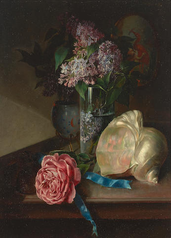 | A still life with a vase of lilacs, a rose and a conch shell on a table | |