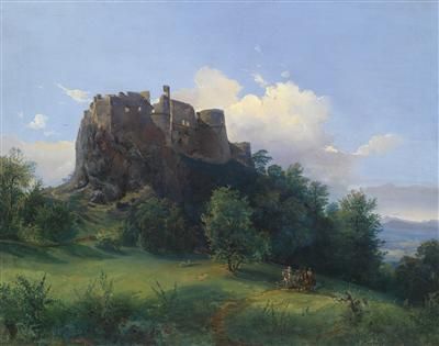 | His Excellence Leopold Count Palffy on a Grey with his Forestry Superintendent Prokop riding below the ruins of Schloss Paulenst | |