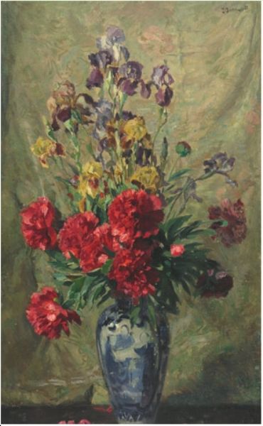 | RED PEONIES AND IRIS IN A BLUE AND WHITE VASE | |