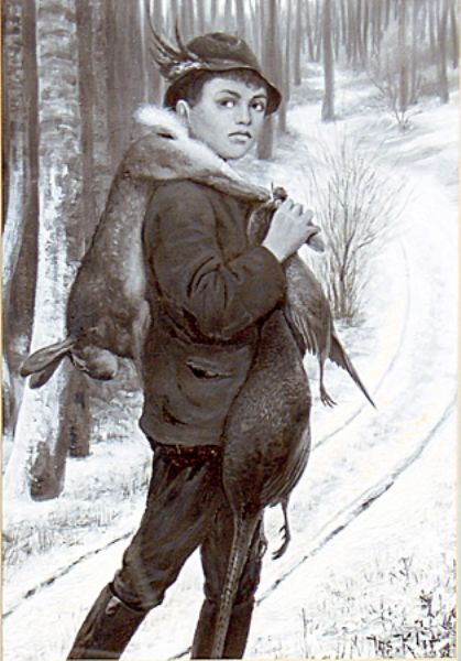 Jäger mit erlegten Wildbrett auf einem verschneiten Waldweg