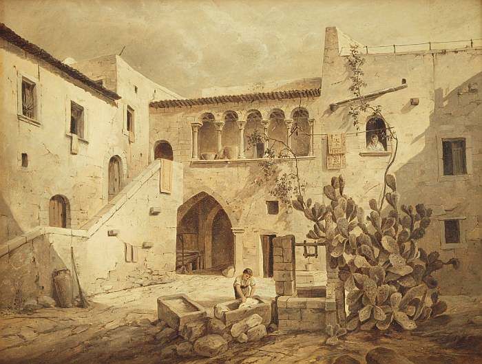 | Blick in einen Innenhof mit einer jungen Frau an einem Steintrog beim Wäsche waschen | |