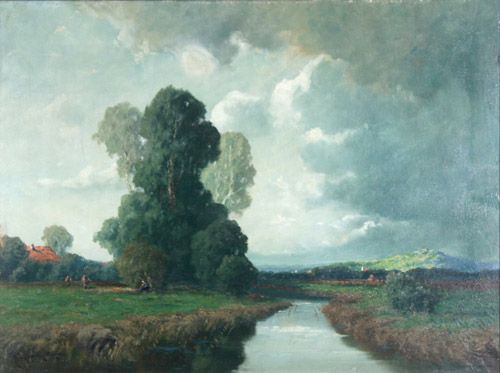 | Gewitterstimmung, Bachlauf mit Kulissenbäumen, links Bauern bei der Heuernte rechts in der Ferne ein Dorf und eine Bergkuppe wor | |