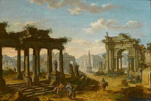 A capriccio of ruins with figures resting beneath a classical portico