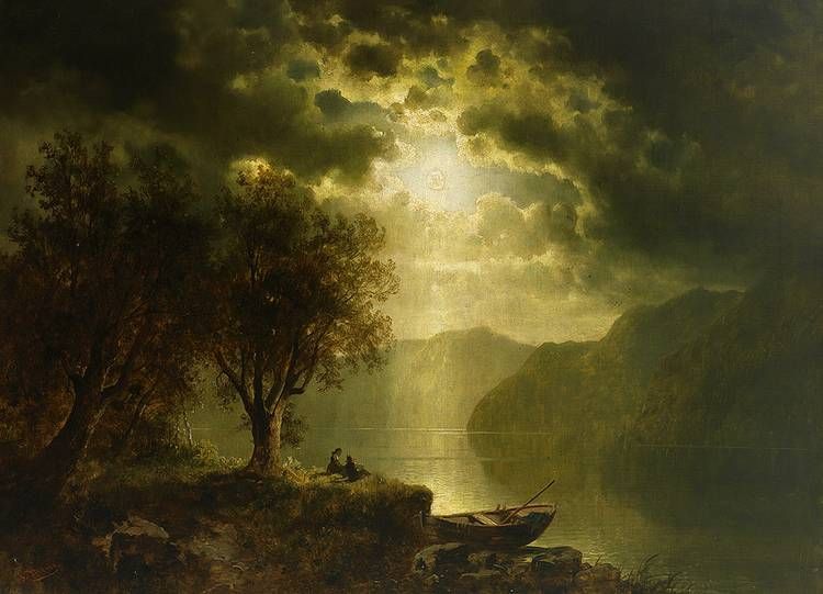 | Ansicht vom Wolfgangsee in einer Vollmondnacht. Am Ufer plauderndes Paar und angelegter Nachen | |