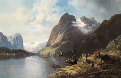 Hardanger Fjord with a Steam Ship Anchored to the Pier